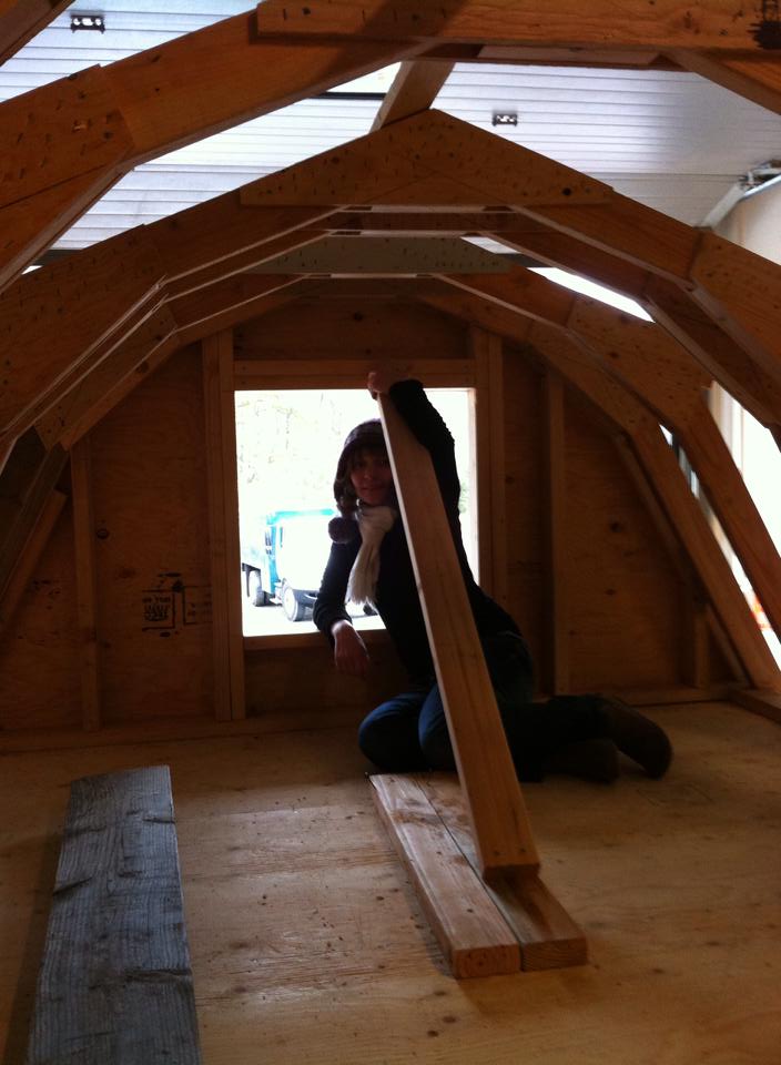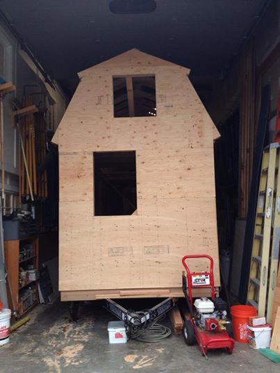 We’re so excited to see our tiny house finally taking shape. The gambrel roof looks great and offers us a lot of headspace inside the bedroom loft. Now only the hurricane ties have to be attached to the rafters and then the roof can be sheathed and covered with metal shingles. 🙂