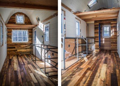 Our tiny house looks more and more like a home! We’re so thrilled about our reclaimed barn wood floor that we also used it on our two smaller walls and on the skylights. The wood came as engineered flooring and was easy to install. Now we just have to put on more tung oil to protect it.