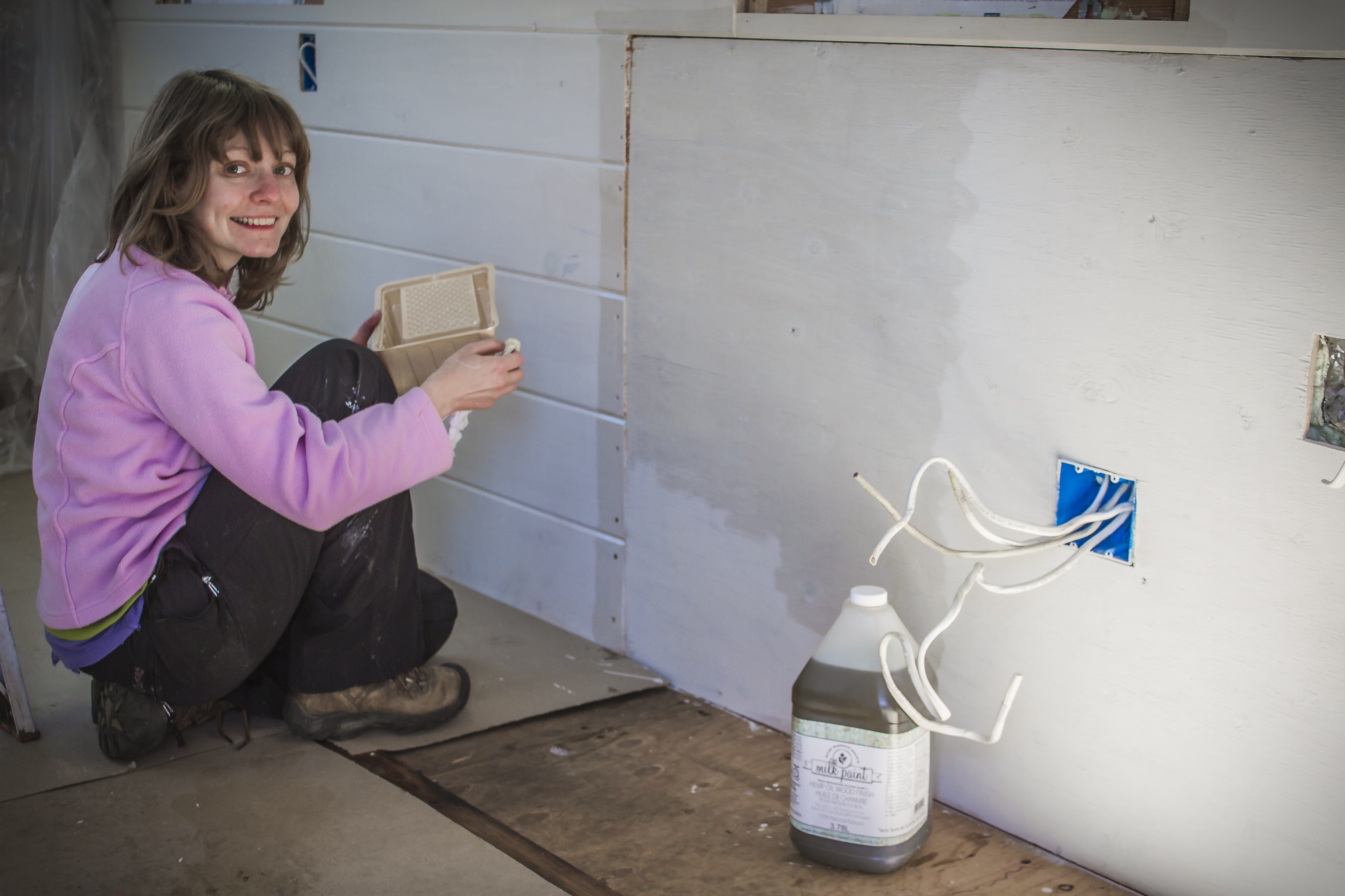 The wall in the kitchen had to be finished before we put the counter back in. To make our milk paint water-resistant we covered it with hemp oil, also from Miss Mustard Seed. It’s very easy to apply and biodegradable as well. It feels just like olive oil on your hands and gives the paint a richer tone.